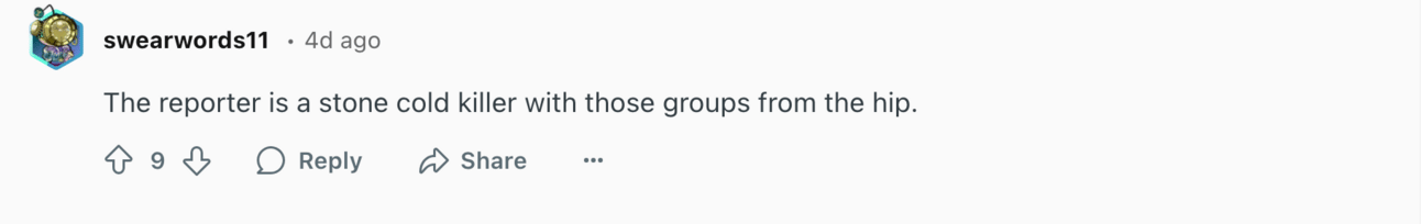‘The reporter is a stone cold killer with those groups from the hip.’